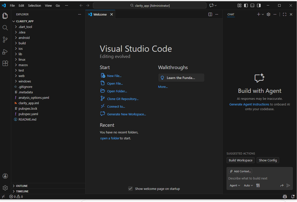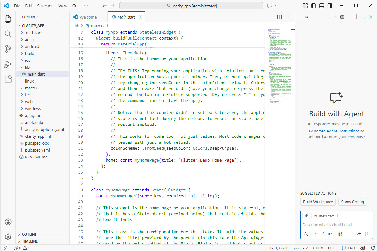 → Tạo một dự án Flutter mới tên là clarity_app.